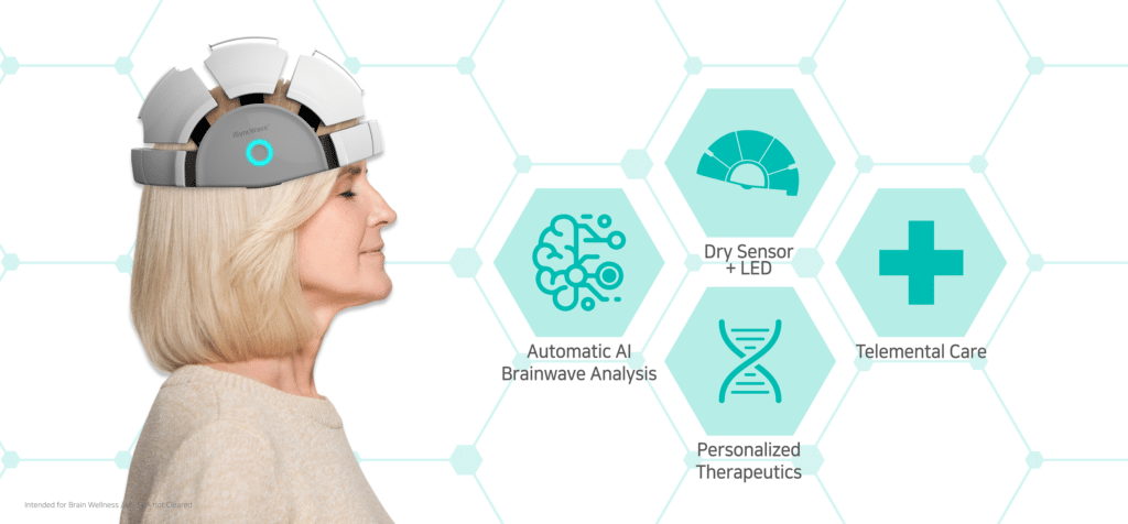 iMediSync has developed a dry sensing EEG brain mapping device with LED photo-biomodulators, iSyncWave. It will work together with iSyncMe – mobile application. Through the app, users will be able to access its cloud-based EEG analysis platform (iSyncBrain®), where the AI analyzes for any abnormalities in the brain function. The 19-channels of LED built-in iSyncWave provides photobiomodulation(PBM) as a non-pharmacological option. The dry sensors make the EEG brain mapping easier and PBM enables a comprehensive therapy at the time of measuring.